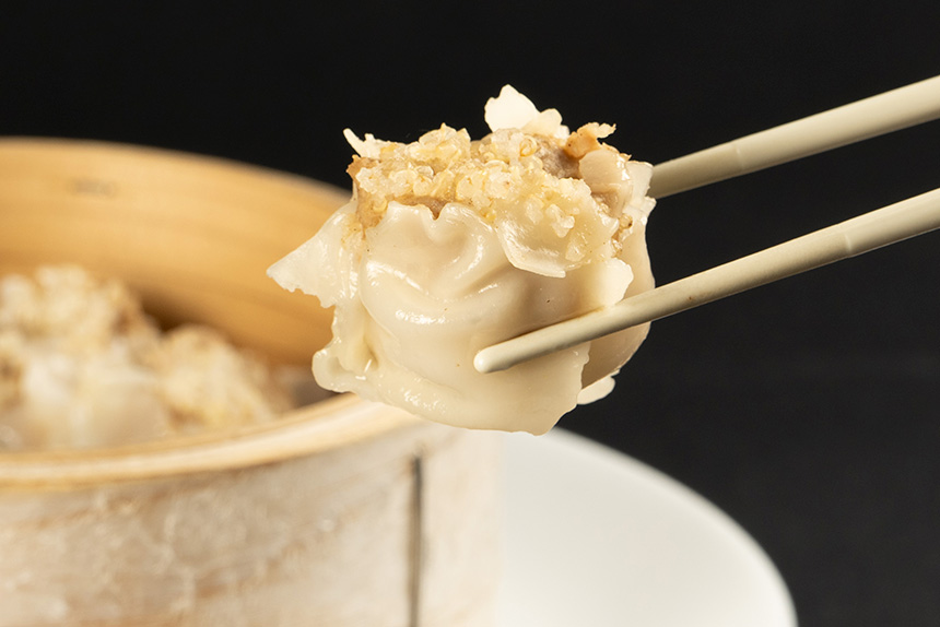 富士山のふもとで育まれたゴテンバポークと裾野産キヌアを使用した「富士の恵み 米粉焼売」。富士山頂の雪をイメージしてキヌアが盛り付けられており、肉汁あふれる豊かな旨みが広がります。玉ねぎと麹を使った醤油ベースの特製ソース付き。